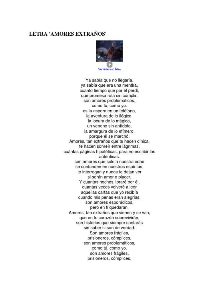 Ya sabía que no llegaría, ya sabía que era una mentira, cuanto tiempo que por él perdí, que promesa rota sin. Letra de la cancion amores extranos version 2001 letra. Que en tu corazón sobrevivirán. Son historias que siempre contarás. Ya sabía que no llegaría ya sabía que era una mentira cuánto tiempo que por él perdí que promesa rota sin cumplir son amores problemáticos como tú como yo es la espera en un teléfono la aventura de lo ilógico la locura de lo mágico un veneno sin antídoto la amargura de lo efímero porque él Aquellas cartas que yo recibía. More images for amores extraños letra español » Romantica laura pausini que bonita suena esta cancion en italiano.laura posee un gran rango vocal, con una voz clásica y de gran alcance, tal como se presen. Amores, tan extraños que vienen y se van. Sin saber si son de verdad. Ya sabía que no llegaría, ya sabía que era una mentira.